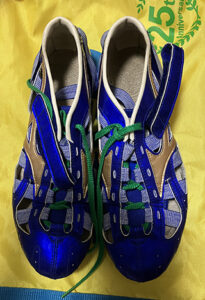 頂きましたスパイクは、100m~1500m、100H~400HまでこなせるMizuno社のスパイク4足と、フィールド専門のスパイク1足で、どれもカッコよかったのですが、その中でも特に目を惹く光り輝いているスパイクがありました。メッシュが入っており、明らかに軽量で、今までに見たことがないデザインの素敵なスパイクでした。
